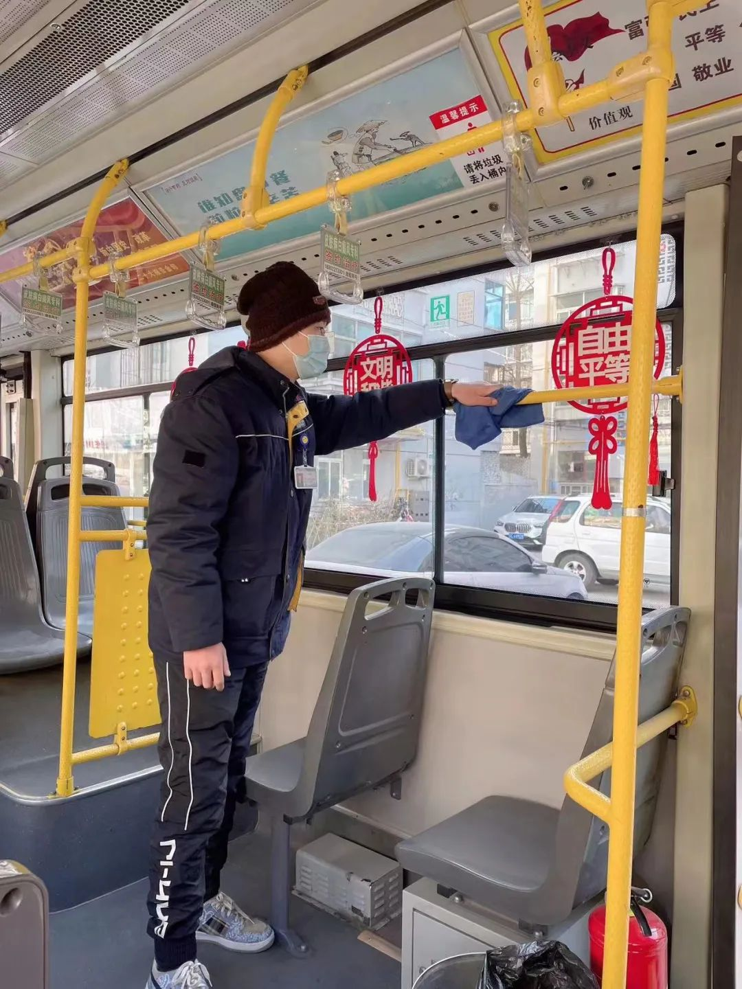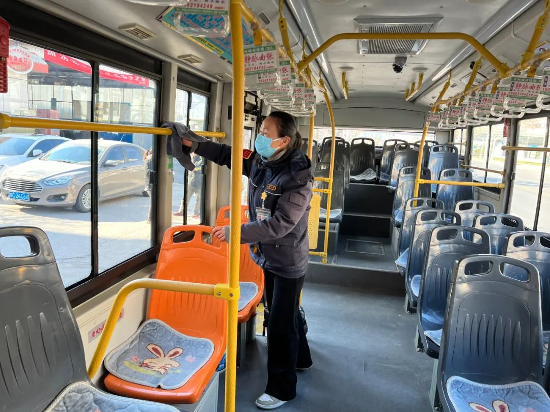 王海芬跑的這條線路,穿過數(shù)條主干道,經(jīng)過工人醫(yī)院、兒童醫(yī)院等一個(gè)個(gè)醫(yī)療中心。這幾天有一位乘客,兒子剛動(dòng)完手術(shù),他每天到醫(yī)院送飯。每次上車,我們都會(huì)互相寒暄幾句,心里也暖暖的。為了自己的健康也為了他人的健康,王海芬利用休停時(shí)間把座椅、扶手等地方用消毒液進(jìn)行擦拭,每一趟的間隙開窗通風(fēng),保證車內(nèi)空氣流動(dòng),她在車內(nèi)配備了藥箱,里面有口罩等防疫物資以備乘客不時(shí)之需。