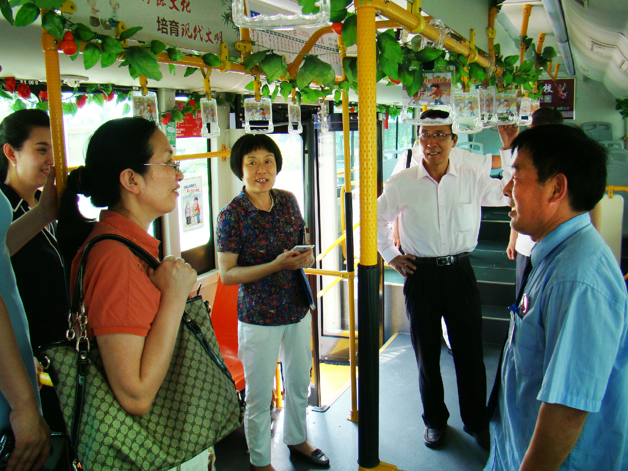 為有效提高老年人乘車安全系數,公司為14路線在車廂內設置“老幼病殘孕”愛心專座的基礎上,專門設置了“敬老專座”; 為了給老年乘客提供優(yōu)美的乘車環(huán)境,還在車廂的頂部和前部放置各種綠色植物和鮮花,同時,在駕駛座后面安裝了便民袋,配備常用藥物、老花鏡、針線包、意見簿及公交乘車指南、報紙、老年人專用雨披等物,讓老年乘客登上公交車,就能感受到清新氣息。