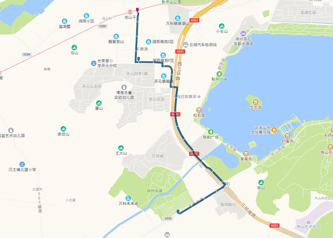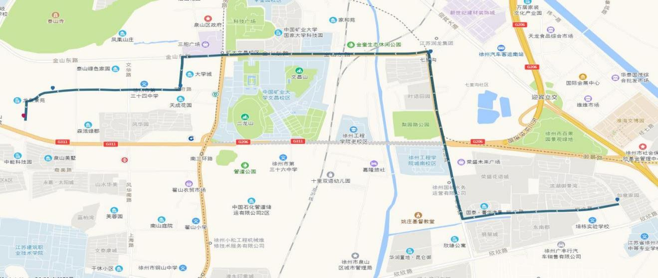 線路站點:御景灣公交首末站、濱湖御景灣南門、姚莊街坊中心、欣欣路口、七里溝地鐵站、礦大北門、大學(xué)城、天成花園、三十四中、三十中附小、泉泰嘉苑、泉山美墅西門(路西,單向)、碧水灣小區(qū)(路北、單向)、泉山法院(路南,單向)。備注:因目前雙山路與三環(huán)南路交叉口正在施工,公交車輛無法通行,319路暫時僅運(yùn)行至泉泰嘉苑。待道路貫通后,進(jìn)行全線路運(yùn)營。