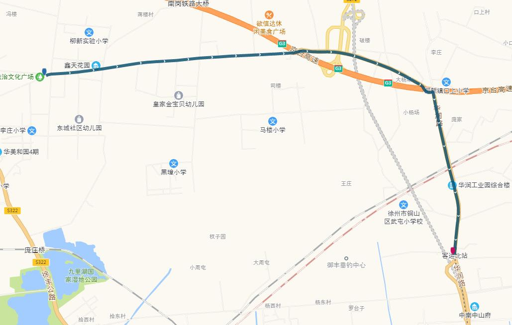 線路站點:建筑學(xué)院、江蘇師范大學(xué)、師范大學(xué)地鐵站、萬科新都會、港鑫城、南洋國際、康樂園南門、無名山公園地鐵站、銅山區(qū)政府、楚河金茂府、嵩山路、銅山新區(qū)總站、久隆鳳凰城北門、保利迎賓館、龍腰山公園、泉山森林海、第一人民醫(yī)院南門。