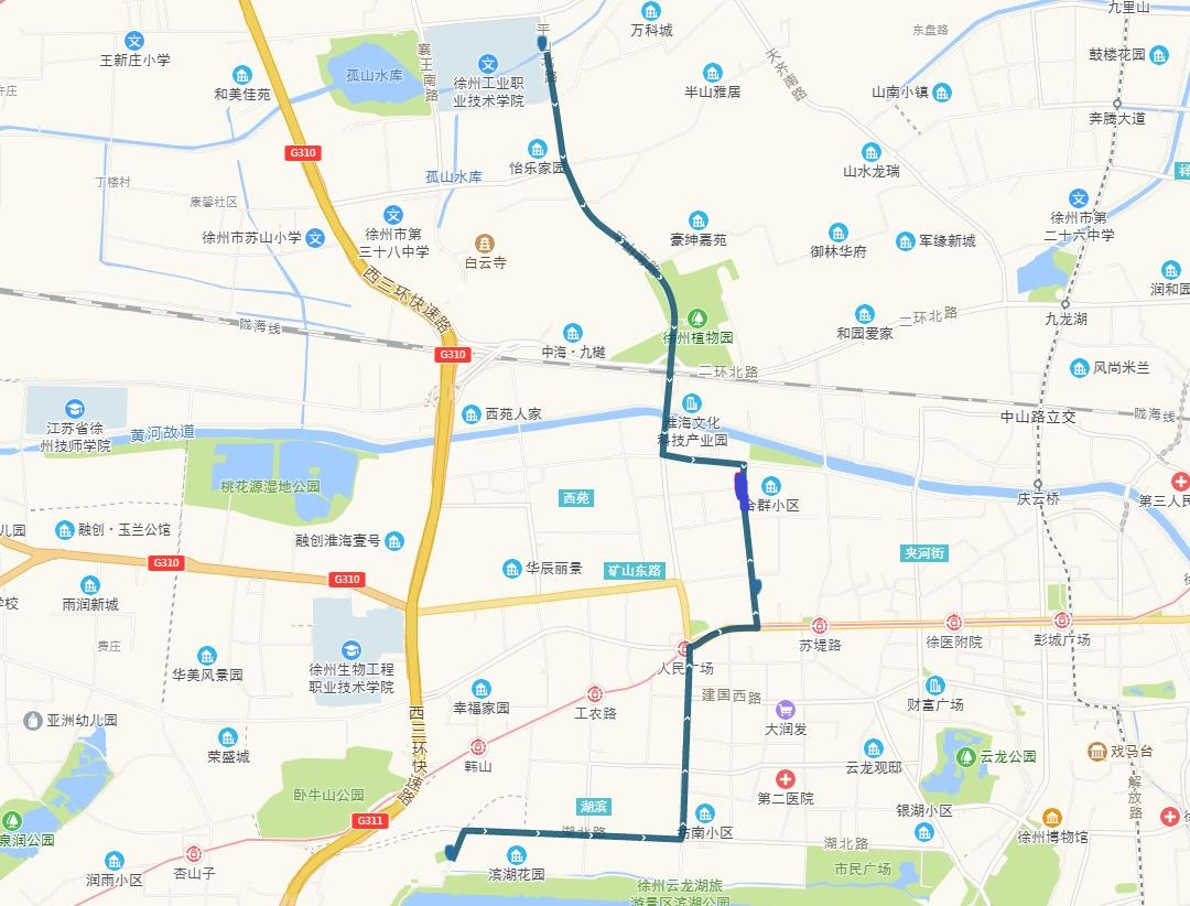 線路站點:山南小鎮(zhèn),山水龍瑞,馬場湖路口,馬場湖,怡康花園,后勤學(xué)院北,誠坤鋼材市場,蘇堤北路立交橋(西),蘇堤北路立交橋(東),蘇堤路小學(xué),永業(yè)花園小區(qū),江蘇四監(jiān),銅沛路東口,中山北路立交橋
