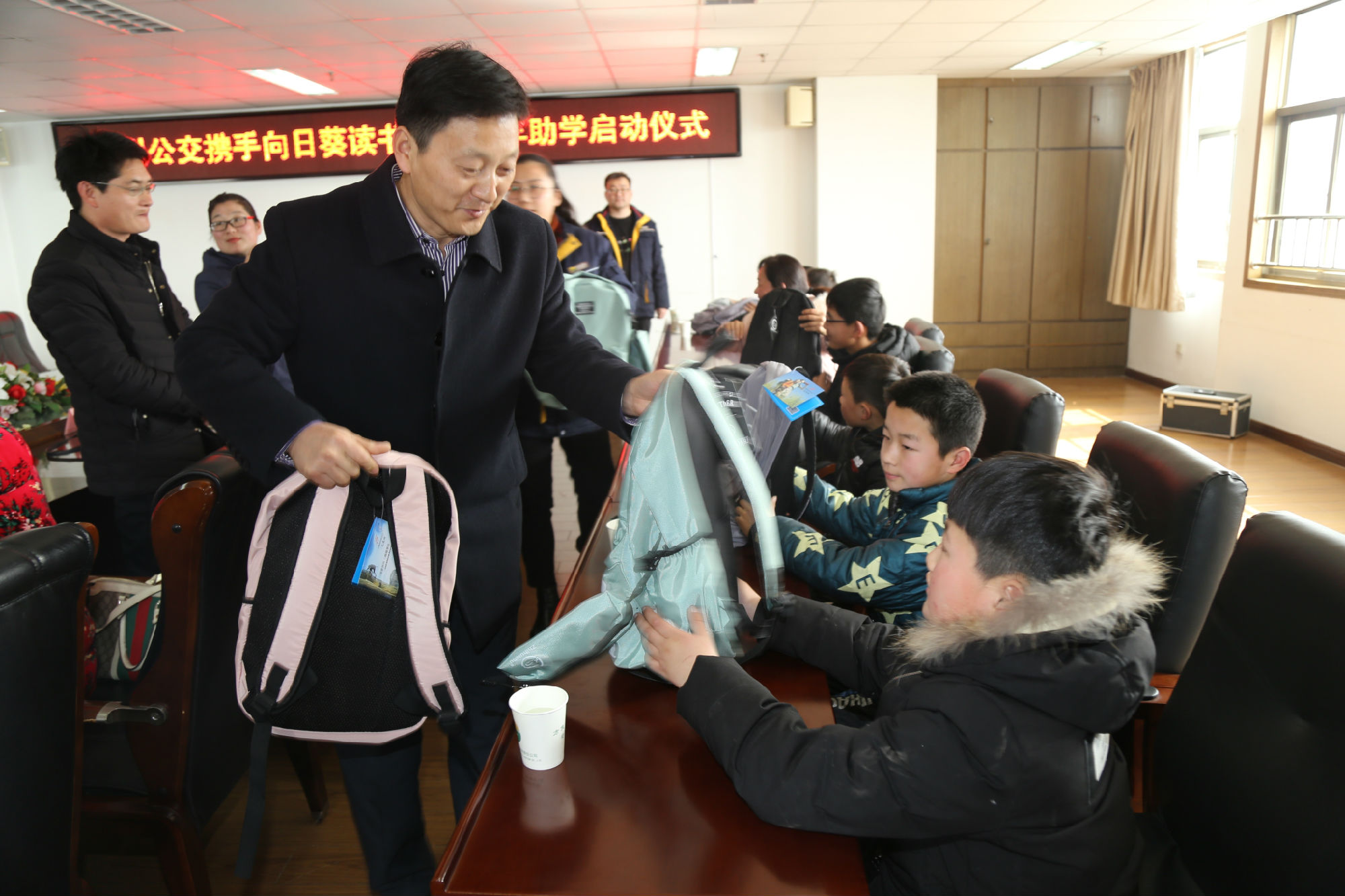 2月24日上午,徐州公交攜手向日葵讀書點2018年助學(xué)啟動儀式在有限公司十一樓會議室舉行。公司董事長、總經(jīng)理杜紅軍,工會主席竇同銀,調(diào)研員張同剛、祖伯鴻等領(lǐng)導(dǎo)出席了活動儀式。最美鄉(xiāng)村教師、江蘇省道德模范、向日葵讀書點負責(zé)人郁雪群,向日葵讀書點副會長、大固小學(xué)校長褚紅玉,向日葵讀書點副會長王光彪,受助家長代表張玲,邳州邢樓鎮(zhèn)受資助10名貧困兒童、5名小志愿者等受邀參加儀式。